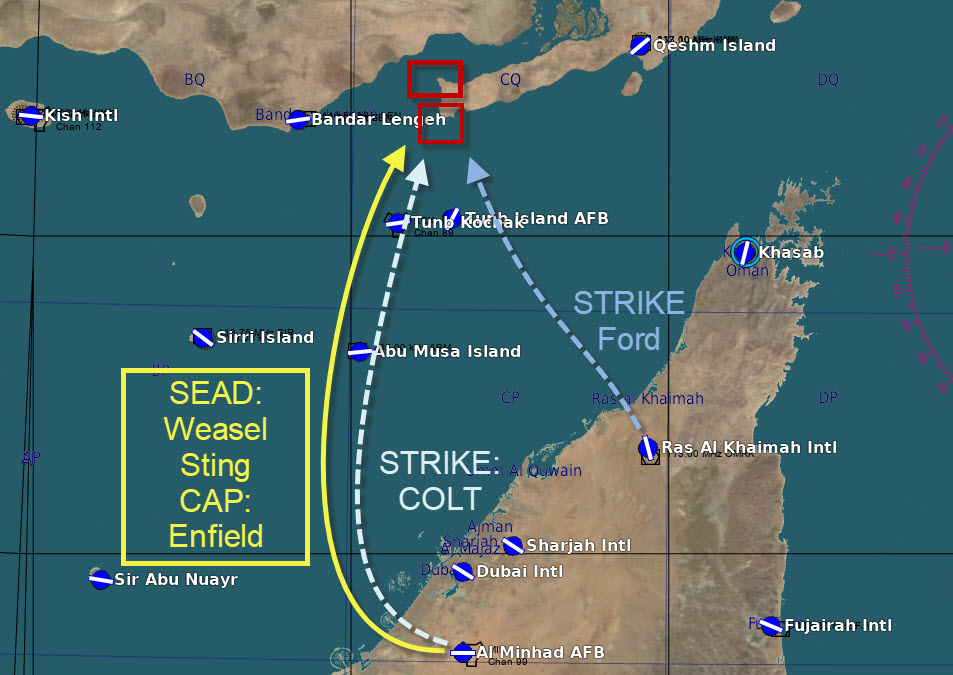 First mission of the Qeshm campaign, in this mission your job is to take off from Al Minhad (for Fast Jets) or Ras Al Khaimah (for Harriers/A10s/Su-25 jets) and find/destroy a build up of new facility on the South West corner of Qeshm Island.
