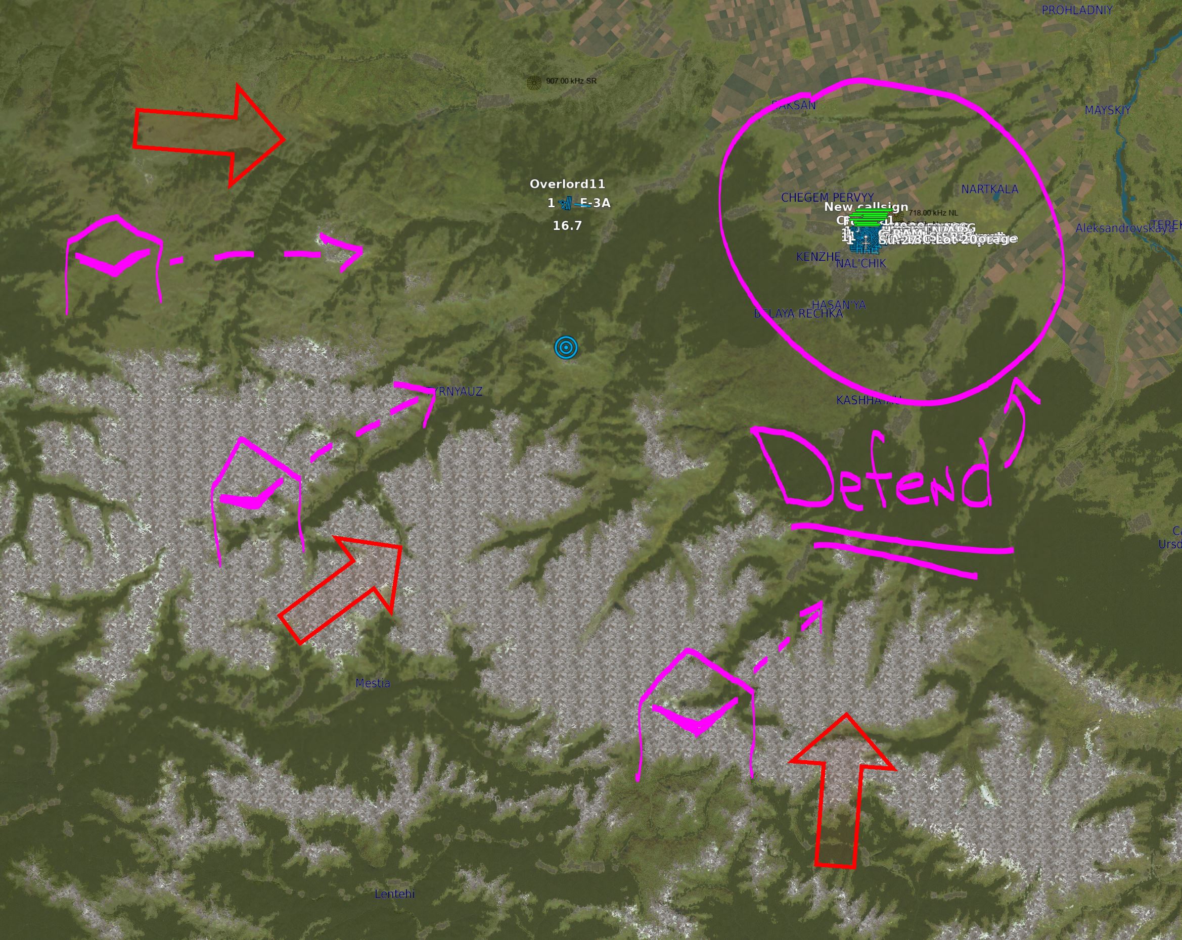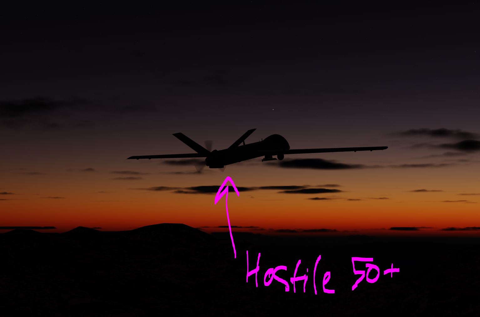 Enemy forces in the region have initiated a surprise attack on our city, and airbase. The enemy force has deployed a force of unmanned drones, cruise missiles and we are bracing for a potential scud ballistic missile attack.This is the real deal and you must scramble. Our AWACS had experienced a generator problem and is forced to land. He will be painting targets for the next few minutes, but after that it will be up to you and your wingmen to use your radars to find the wave of drones and intercept them. The next AWACS will be airborne shortly, however, there will be a gap. This airbase has formidable defenses, Patriot, CIWS, and Hawks, however, the more drones you can stop the more missiles the ground interceptors will have to deal with any cruise missiles and scuds. Good Luck!