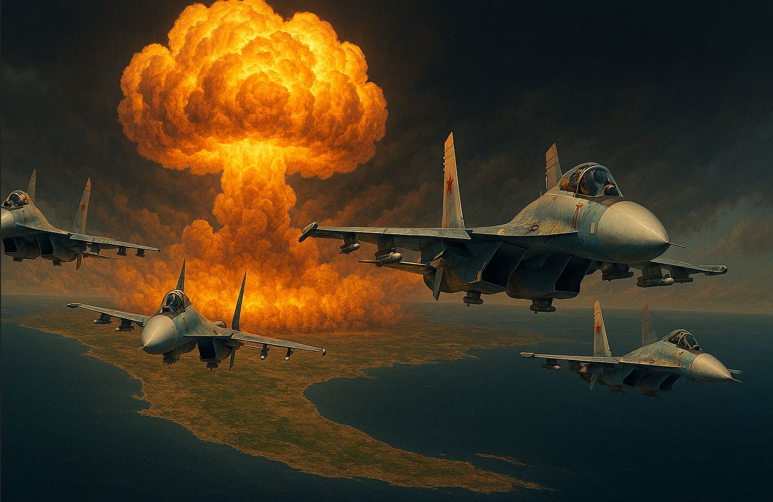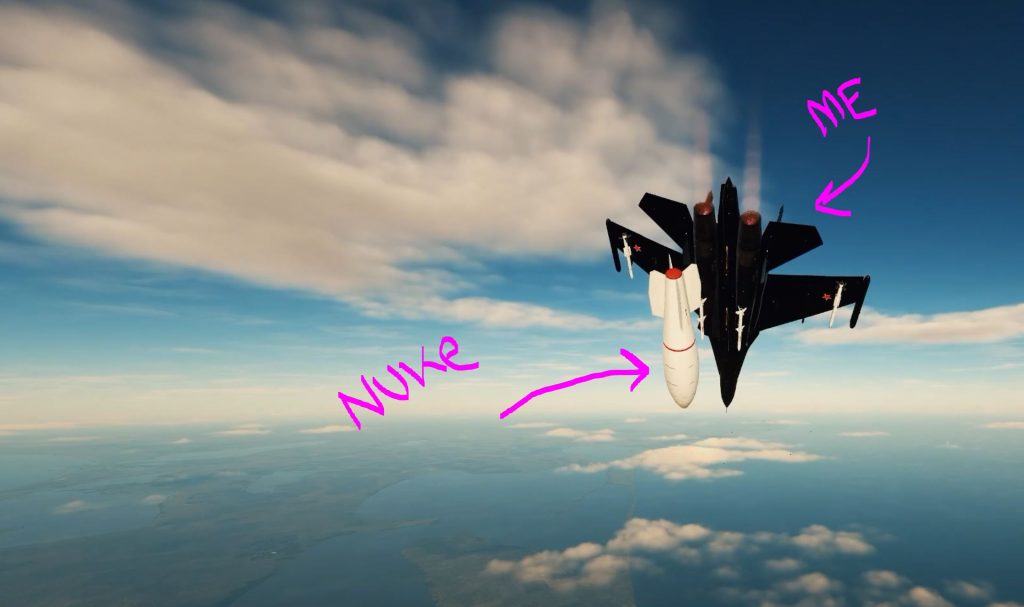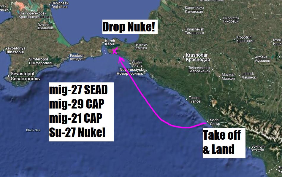 A one hour long mission where you take charge of a Mig-29, Su-27 or J-11 with air to air and also one special device. A nuclear bomb. Your target is a blue forward operating post on Taman peninsula north of Krasnodar krai coast. Good luck pilots